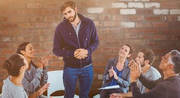 With a small stage and theatrical lighting, the atmosphere can be adjusted to focus on the speaker or open the room to all.